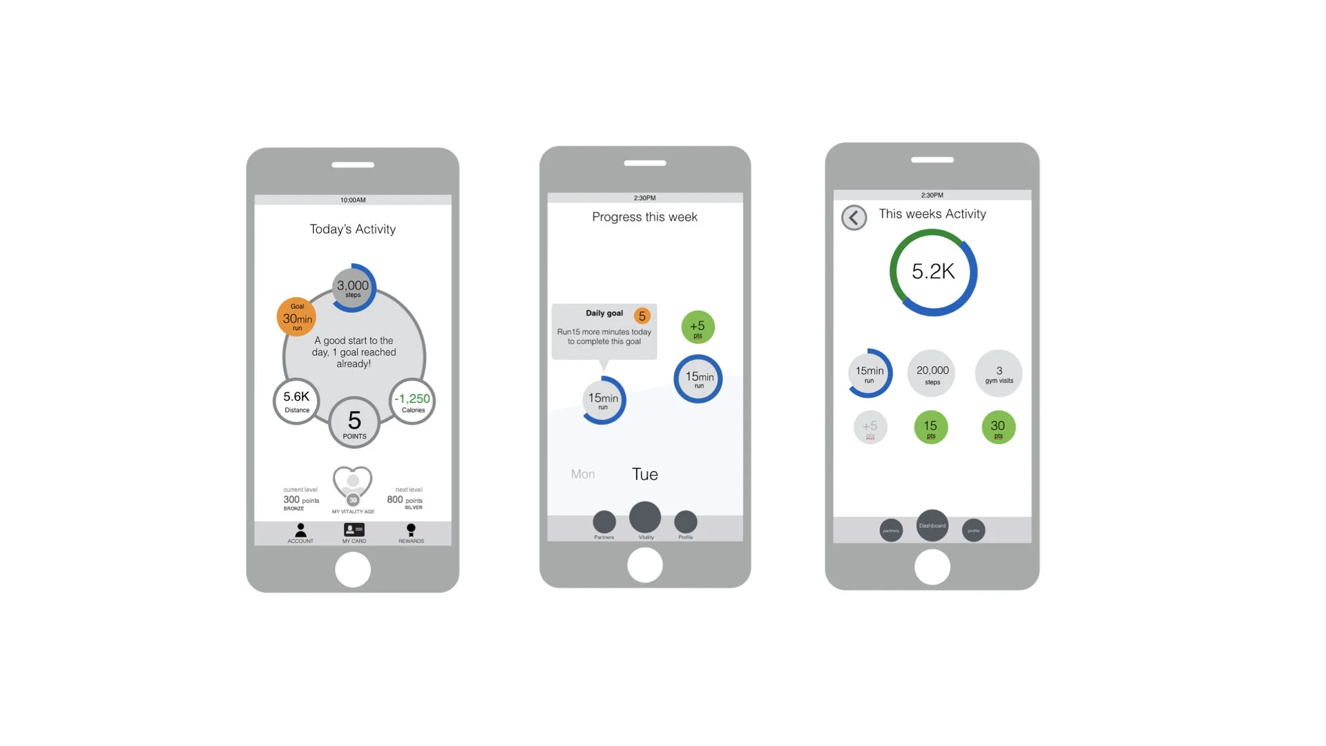 Rewards and notifications would appear here. each item would, when tapped on take you to different sections to access your stats for calories burned, steps, goals etc. You could also attach a number or tracking devices to the app such as Garmin and FitBit trackers to name a few. This data would be read into the Vitality app and displayed within the dashboard.